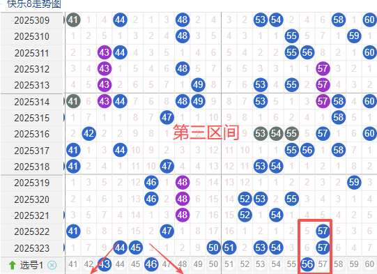 三区间开出了7个奖号(44.45.50.51.53.54.57)上期回顾三区开出7个奖号上期的三区间的奖号数量呈现一个递增的形态,4头回补2个,本期先来看号码43近期出现频率相对来说还是很稳定。偶尔有时间隔期数也是很长,说明其在近期的开奖中较温热的,号码46在近 30 期内出现次数相对还不是稳定的号码,近期的活跃度也是较冷。号码56有一定的间歇性,通常间隔5-3期会出现一次,没有明显的连续出现态势,走势相对较稳定,在整个第三区间的表现本期还是可以防守的。号码58走势相对近期较热,近期没有连续间隔落号的情况,活跃度近期处于较稳定状态注意防守。