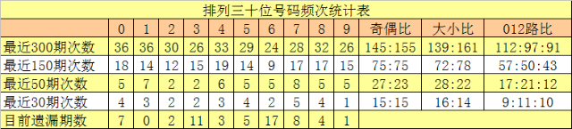 十位号码:前50期走势最活跃的号码为:7开出8个,1开出7个,4开出6个;走势最冷的号码为:2、3开出2个,0、5、6、8、9开出5个。十位号码012路比开出17:21:12,大小比开出28:22。本期十位排除两码:3、8,参考号码2、5、6,胆码关注5。