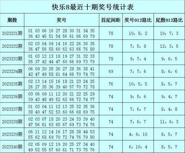 福彩快乐8第2023240期开出奖号:02 05 09 12 19 20 25 27 34 40 49 52 55 57 60 61 71 73 75 76,其中奖号012路比为6:10:4,尾数012路比为8:12:0。