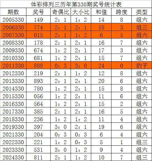 在历年排列三第331期开奖中:组三号码出现4次,组六号码出现14次。组六号码出现比例略高,本期奖号形态参考:组六号码。
