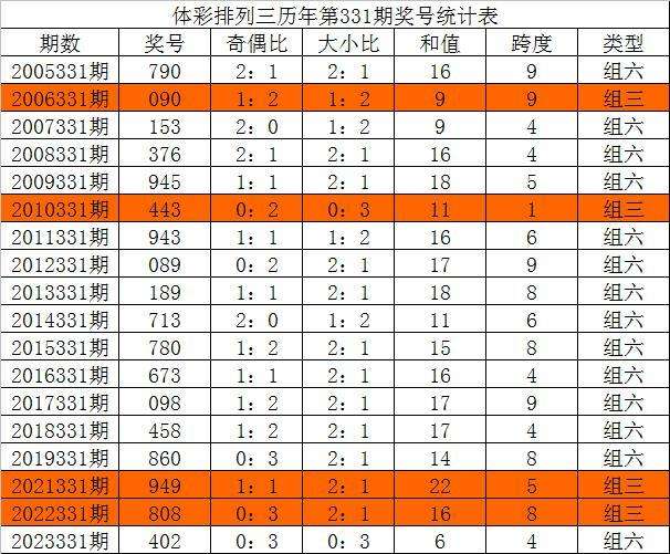 体彩排列三历年第331期开出奖号分别为:790、090、153、376、945、443、943、089、189、713、780、673、098、458、860、949、808、402。统计详见下表: