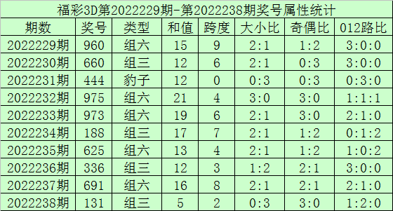 开奖回顾:福彩3D第2022238期开奖号:131,其中奖号和值:5,奇偶比3:0,大小比0:3。