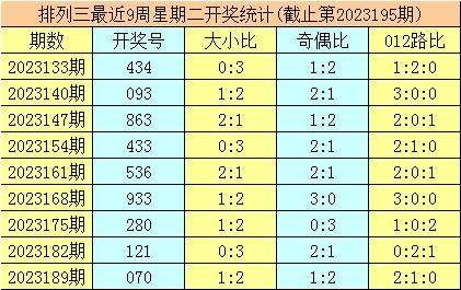 三、体彩排列三前9周星期二奖号分别开出:434-093-863-433-536-933-280-121-070,其中号码012路比为16:6:5,奇偶比为14:13,大小比为8:19;
