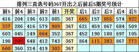 四、排列三直选号码367历史上开出5次,其前后五期奖号分别为: