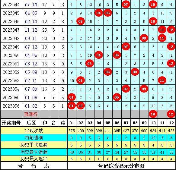 前区尾数频次统计:在第057期历史同期开奖中,前区尾数7开出次数最多,为12次,尾数5出现11次,尾数4出现9次,尾数0、2出现8次,尾数1、3、8出现7次,尾数6出现6次,尾数9出现5次,本期前区奖号必杀一尾:9。