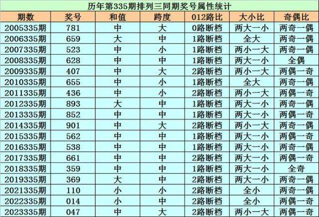 历史上第2024335期排列三已开出18期奖号了,历年同期奖号分别为:781、659、523、628、407、655、436、893、852、901、562、538、661、359、369、110、014、047,详细统计见下表: