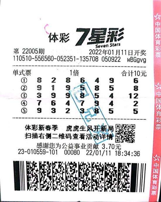 1月9日,老蔡应朋友之邀赴宴。因为朋友间有着“吃饭不掼蛋,等于没吃饭”的笑谈,所以老蔡一早就动身出发。下午1点多钟,老蔡中途恰好经过梅花山庄处的福彩销售点,想到当晚双色球开奖,于是停下脚步前往购买。前后两分钟,老蔡便离开销售点,兜里多了一张1张随机5注号码,并2倍倍投的彩票。