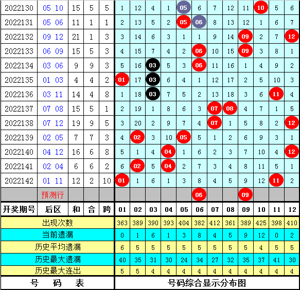 后区分析:最近10周星期三后区号码奇偶比为8:12,偶数开出频次较高,号码大小比为10:10,大小号码开出比例基本持平,本期后区精选两码06和09。