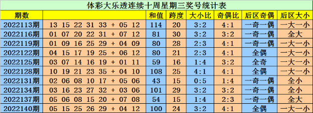 前区大小比推荐:最近10周星期三前区大小奖号总比例为22:28,其中有5期大号热出,有5期小号热出,小号表现比较活跃,最近3周星期三奖号大小比分别为3:2、1:4、3:2,本周星期三适当关注小号热出,参考大小比2:3。