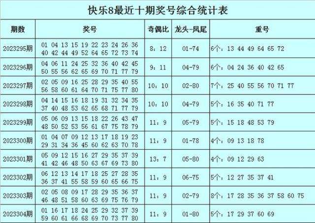 福彩快乐8第2023304期开出奖号:01 16 17 18 24 25 29 32 37 39 59 60 61 66 68 69 70 73 77 80,其中奖号奇偶比为11:9,出现5个重号17、29、37、60、69,开出连码16 17 18、24 25、59 60 61、68 69 70。