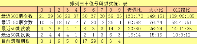 十位号码:前50期走势最活跃的号码为:8开出14个,2开出8个,1开出7个;走势最冷的号码为:4开出1个,5、6、7、9开出3个。十位号码012路比开出14:11:25,大小比开出26:24。本期十位排除两码:8、9,参考号码0、1、6,胆码关注0。