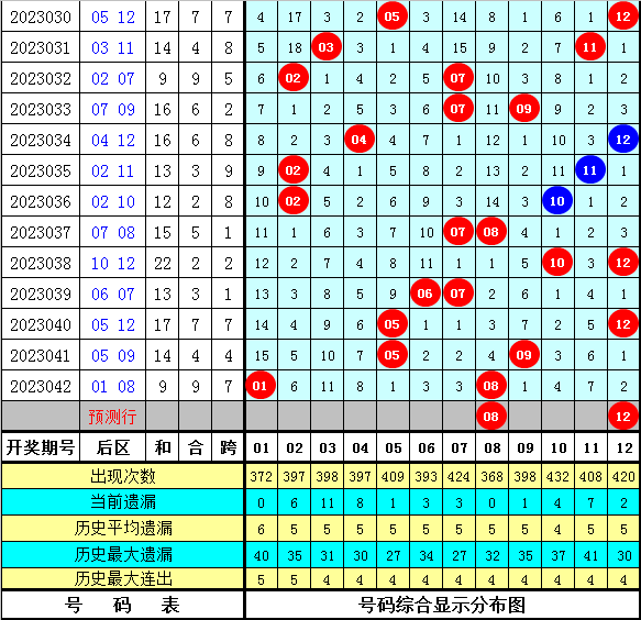 后区分析:上期后区奖号为01+08,本期后区注意重复号码出现,大范围参考号码03、06、08、12。