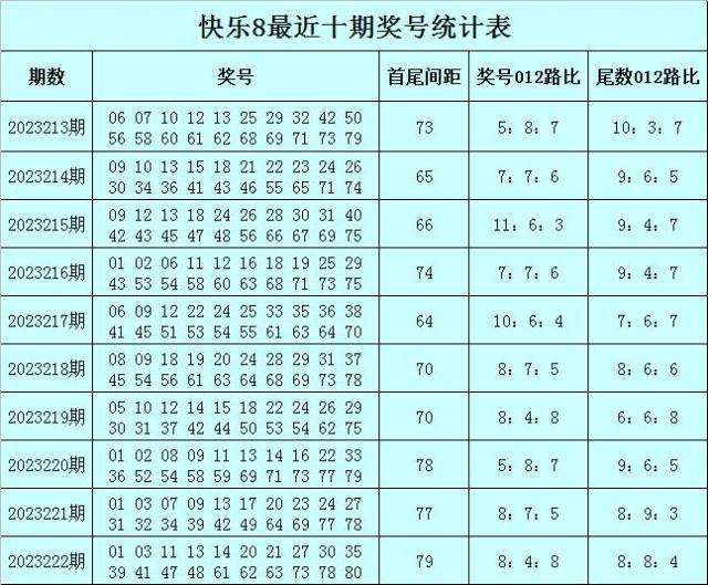 福彩快乐8第2023222期开出奖号:01 03 11 13 14 20 21 27 30 35 39 41 47 48 61 62 63 73 78 80,其中奖号012路比为8:4:8,尾数012路比为7:13:0。