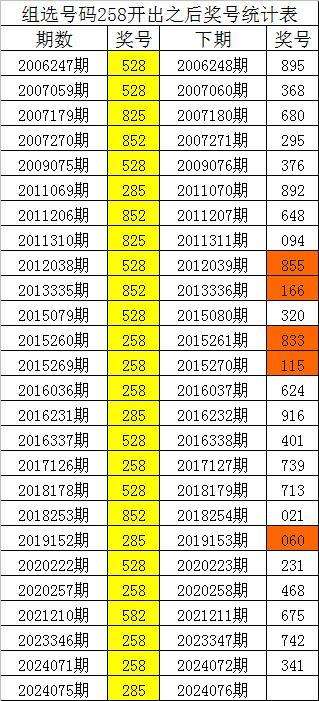 体彩排列三组选号码258历史上出现了26次,其下期奖号分别为:895、368、680、295、376、892、648、094、855、166、320、833、115、624、916、401、739、713、021、060、231、468、675、742、341,详细统计见下表: