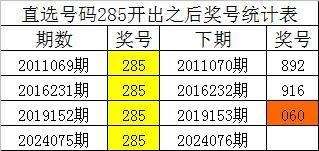 从上表统计可以看出,直选号码285开出之后,其下期奖号: