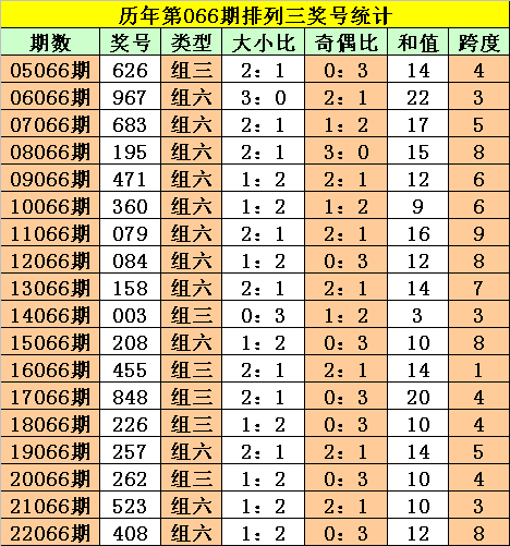 历年第066期排列三奖号:626 - 967 - 683 - 195 - 471 - 360 - 079 - 084 - 158 - 003 - 208 - 455 - 848 - 226 - 257 - 262 - 523 - 408。