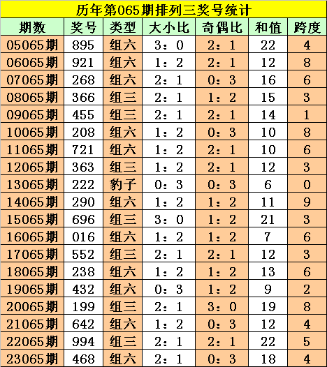 排列三第2023065期奖号:468,和值18,跨度4,大小比2:1,奇偶比0:3。