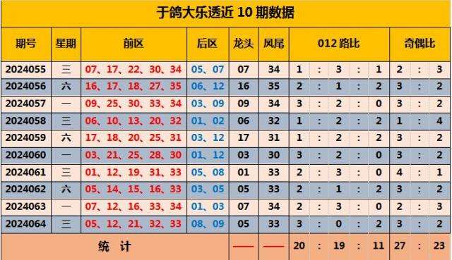 上期前区号码012路比是3:0:2,近10期大乐透前区012路总比20:19:11,本期预测012路比2:1:2。