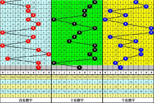 前三次百位号码7出现之后,其下期奖号分别开出:8、6、9,出现在:低频区域、低频区域、高频区域,本期百位排除高频区域号码,绝杀5码:02459。