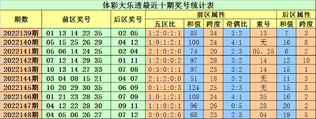 上期开奖:体彩大乐透第2022148期开奖号码为:04、05、06、26、27+07、12。前区五区比为3:0:0:2:0,和值为68,首尾间距为23,奇偶比为2:3,开出1个重号:04。后区号码和值为19,跨度为5。
