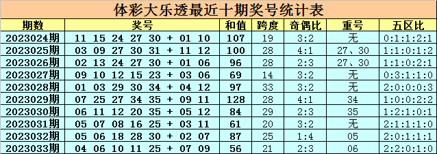 上期开奖:大乐透第2023033期奖号为:04 06 10 11 25 + 07 09,前区号码和值为56,跨度为21,奇偶比为2:3,重号:06,五区比为2:2:0:1:0。