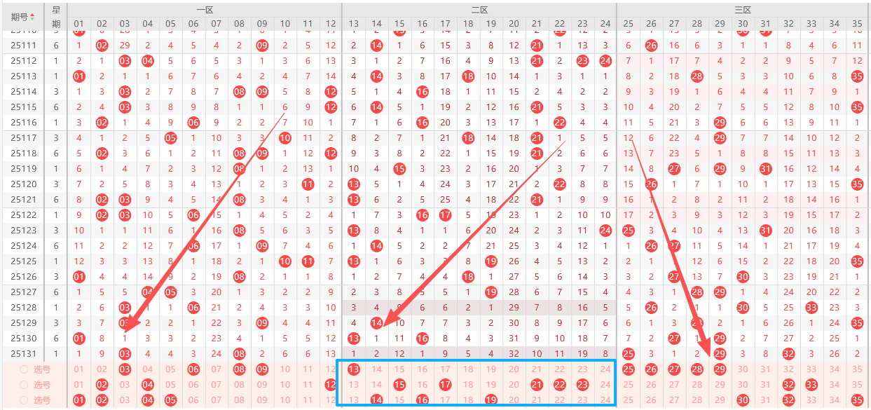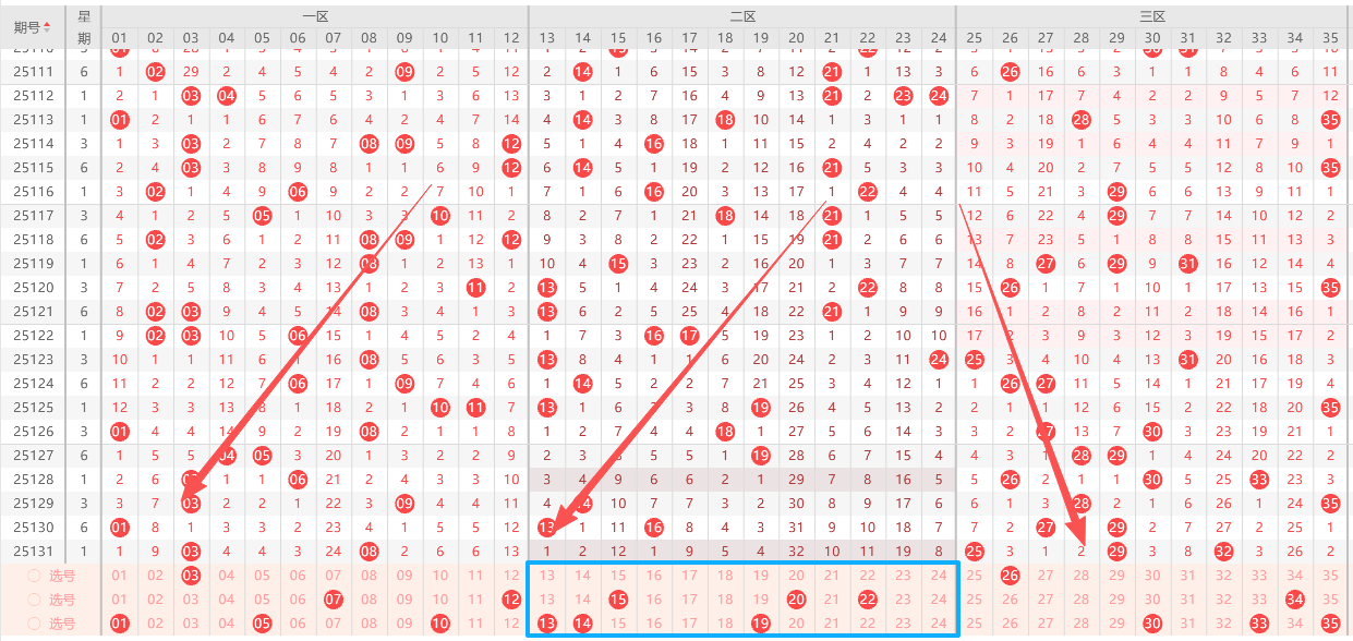 第三区:本期的凤尾,可以考虑33和34,35几个号码,3区号需要考虑26和30这几个号码。