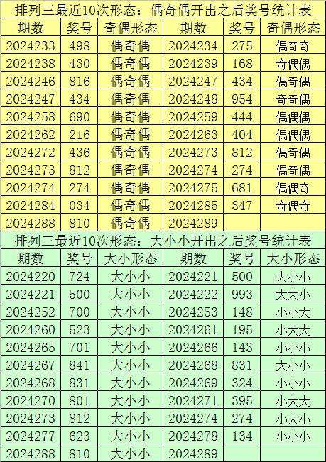 开奖回顾:体彩排列三第2024288期开出奖号:810。奖号基本特征为: