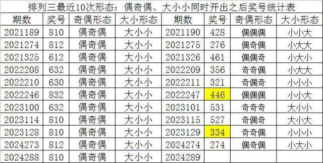 排列三最近10次同时开出奇偶形态:偶奇偶和大小形态:大小小时其奖号分别为:810-812-612-632-630-832-632-810-810-812-810,下期分别开出号码为:428-276-461-356-321-446-531-527-334-274,详细统计见下表: