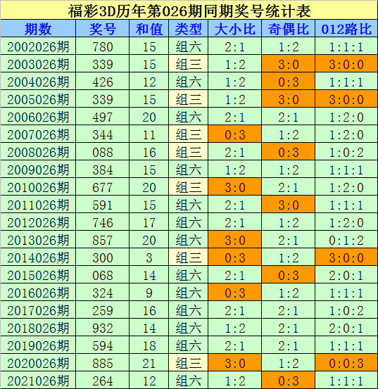 组选类型判断:在第026期历史同期开奖中,组六开出13次,组三开出7次,今年同期看好开出组六号码。