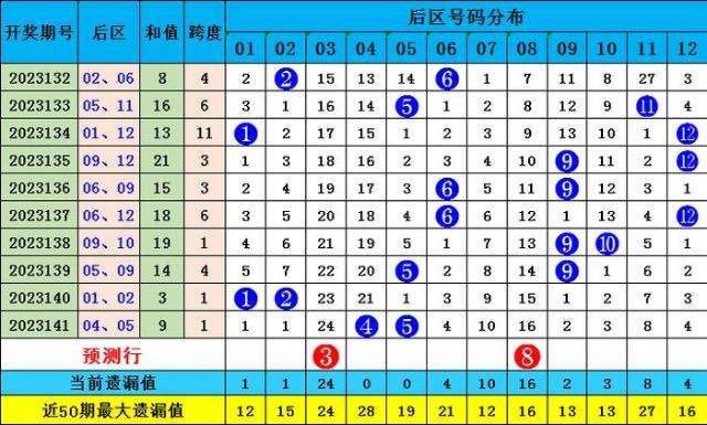 上期后区中奖号码为04 05,近10期后区综合奇偶比10:10,奇偶数出号持平,本期推荐奇偶组合03 08: