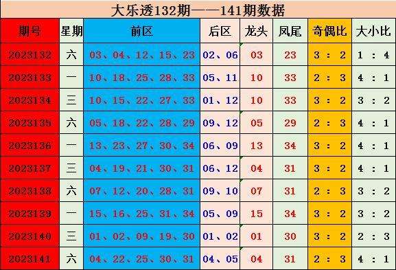 大乐透2023141期开奖:前区04 22 25 30 31,后区04 05。龙头:04,凤尾31,奇偶比为3:2,大小比2:3。
