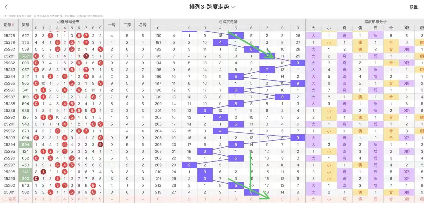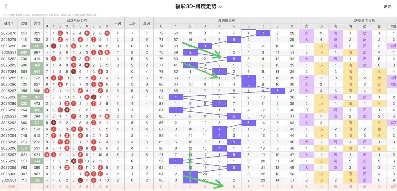 10期内跨度走势为:4-9-5-3-5-2-3-3-5-6,10期内大小跨比:5:5,奇偶跨比7:3,百期内跨度6共开出的14次,下期数据:4 4 4 6 3 2 3 3 3 6 5 1 7 近期度较热,考虑跨度6开出后容易出大跨度,近期大小规律下大:奇:质,所以接下来继续大跨,奇跨度表现!