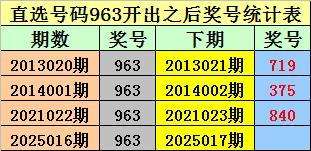 排列三直选963出现之后下期奖号分别为:719-375-840。