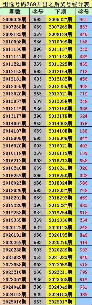 排列三组选369出现之后下期分别开出:461、833、840、168、243、889、435、718、456、462、719、248、036、624、375、168、947、402、139、658、320、038、506、768、459、823、618、234、248、849、414、593、840、518、792、619、631、389。
