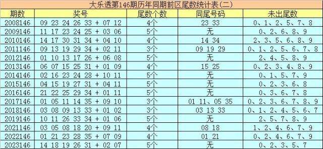 大乐透历年同期第146期后区尾数奇偶比为17:13,最近5年尾数奇偶比为7:3,后区尾数大小比为11:19,最近5年尾数大小比为5:5,本期后区注意号码06、07、09、11、12,后区两码关注06、07。