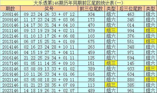 在大乐透第146期历年同期奖号中,前区后三位尾数出号频次分别为:尾数3、4出现8个,尾数5、9出现6个,尾数1出现5个,尾数6、8出现4个,尾数0、7出现2个,尾数2没有出现。其中尾数数字三类型豹子、组三、组六次数比为0:4:11,今年同期后三位尾数类型参考组六;