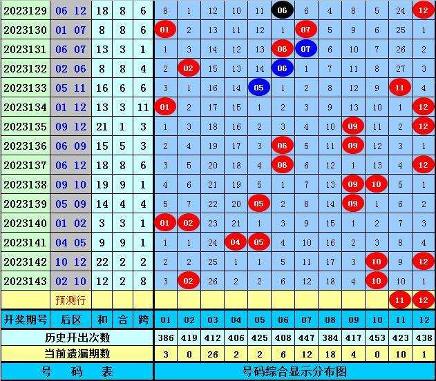 后区分析:上期后区开出第一区和三区号码02+10,最近10期后区三区落号比为1:0:1,最近5期后区三区落号比为0:1:1,本期后区号码大范围关注05、06、10、11、12,后区精选两码11、12。