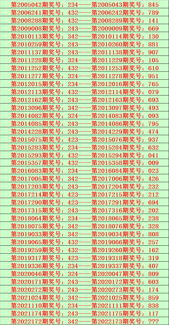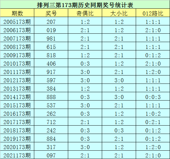 排列三第2022173期开奖日期:2022年7月2日,历史上第173期已开出了17次奖号,历年同期号码分别为:207、019、981、615、818、406、917、597、384、888、537、262、712、242、884、317、097。