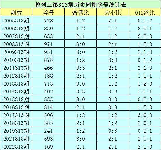 排列三第2023313期开奖日期:2023年11月23日,历史上第313期已开出了17次奖号,历年同期号码分别为:728、830、633、971、931、878、466、138、713、402、555、314、306、383、241、593、169。