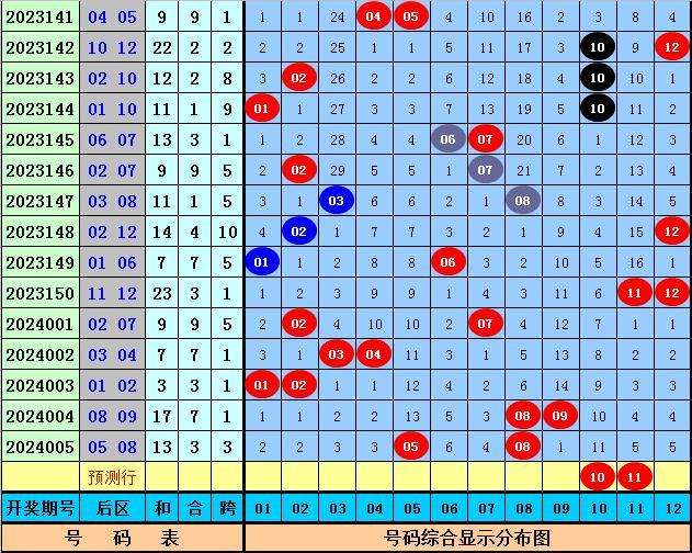 后区号码分析:上期后区开出奖号05 08,和值为13,跨度为3,本期后区参考号码06、07、08、10、11。