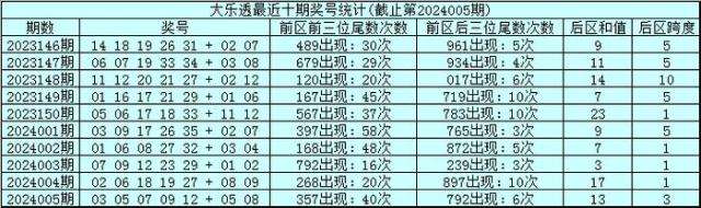 体彩大乐透第24005期奖号开出:03 05 07 09 12+05 08,前区奖号大小比为0:5,012路比为3:1:1,奇偶比为4:1,后区号码和值为13,跨度为3。