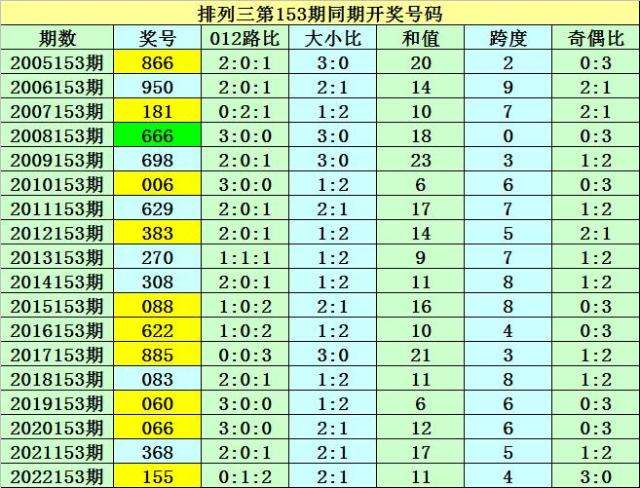 本期为排列三第2023153期开奖,开奖日期为:2023年6月12日,历史上排列三第153期已开出了18次奖号,历年同期开出号码分别为:866-950-181-666-698-006-629-383-270-308-088-622-885-083-060-066-368-155。