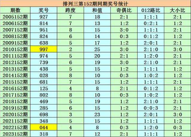号码跨度:在第153期同期奖号中,跨度开出频次分别为:跨度6、7、8开出3期,跨度3、4、5开出2期,跨度0、2、9开出1期,跨度1没有出现。去年同期开出4,今年同期预计跨度上升,注意跨度6。