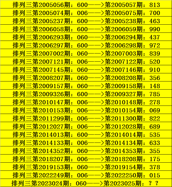 第2023024期排列三奖号为060,历史上该号码组选开出23次,下期奖号分别为:813、700、463、990、437、972、839、520、910、356、148、785、278、069、822、689、535、633、355、175、378、015。