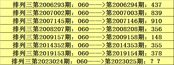第2023024期排列三奖号为060,历史上该号码直选出现8次,下期奖号分别为:437、839、910、356、148、355、378。