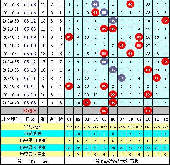 上期回顾:体彩大乐透第24040期奖号为:05 12 16 29 30+03 06,前区奖号大小比为2:3,012路比为2:1:2,奇偶比为2:3,后区奖号大小比为0:2,奇偶比为1:1。