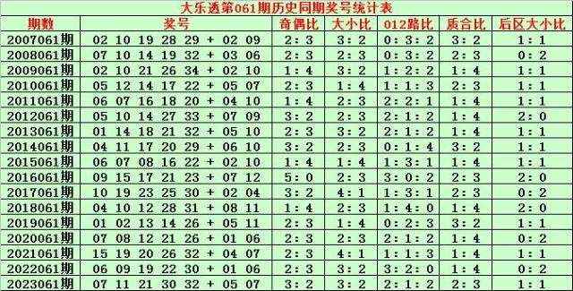 4、在历史同期第061期开奖中,前区号码012路总比例为22:31:32,0路号码走势最冷,本期注意012路号码基本持平,关注012路比2:1:2。