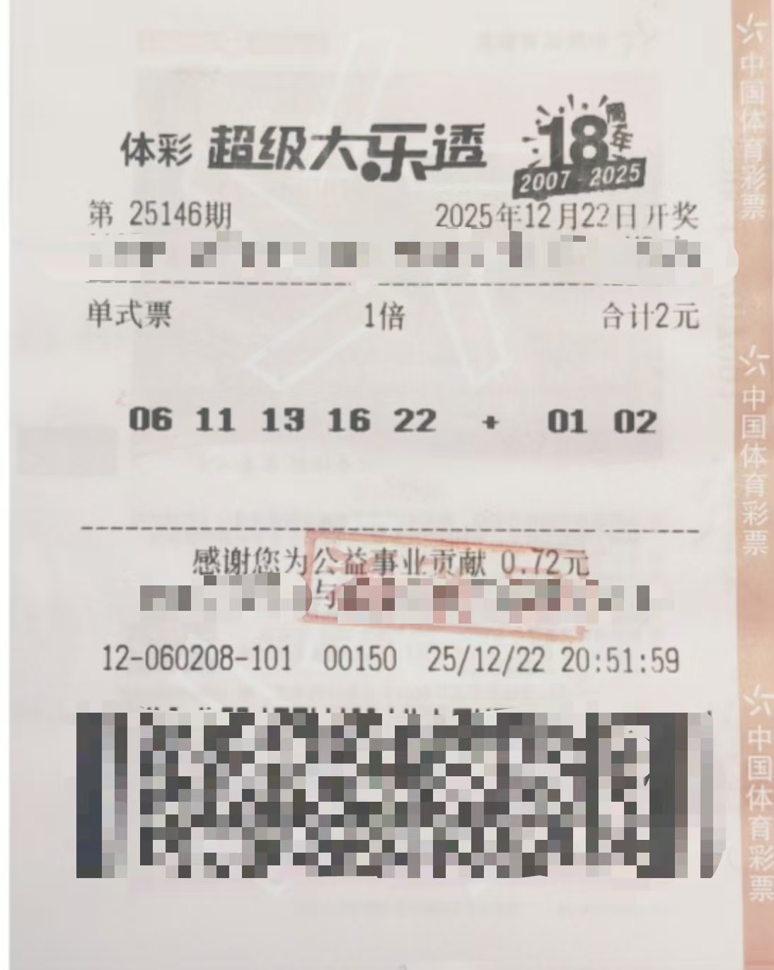 2025年12月22日晚,体彩大乐透第25146期开奖号码为"06、11、13、16、22+02、03"。来自潍坊的一位资深彩民凭借一张2元单式票,精准命中当期二等奖1注,喜获奖金15.1万元,再现以小博大的购彩佳话。