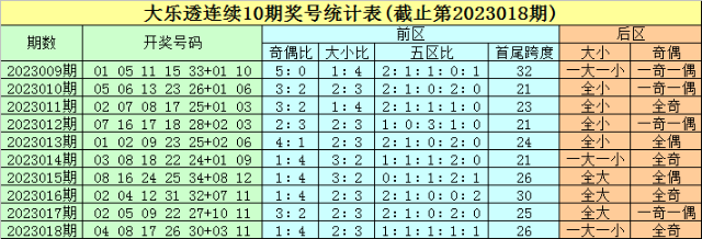 上期回顾:体彩大乐透第2023018期开出奖号:04 08 17 26 30 + 03 11。其中前区奖号奇偶比为1:4,大小比为2:3,五区比为1:1:1:1:1,跨度为26。后区奖号大小比为1:1,奇偶比为2:0。