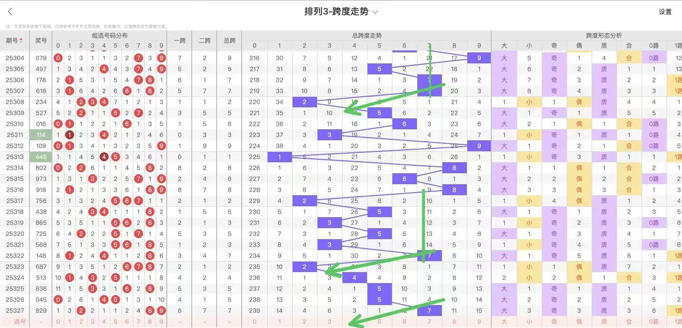 10期内跨度走势为:5-3-5-3-7-2-4-5-5-7,10期内大小跨比:6:4,奇偶跨比8:2,百期内跨度7共开出的13次,下期数据:6 3 3 3 2 5 2 9 5 7 2 2 近期度较热,考虑跨度7开出后容易出大跨度,近期大小规律下小:偶:合,所以接下来继续小跨,偶跨度表现!